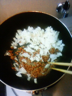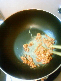 まず納豆を炒め、ねばねばがなくなってきたらキャベツを入れます