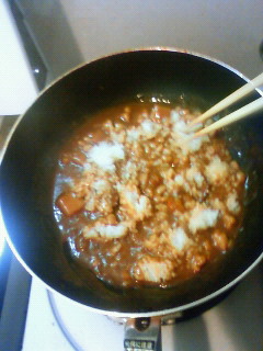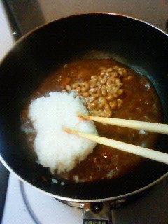 カレーがぐつぐつしてきたら、ご飯と納豆を投入!そりゃっ!