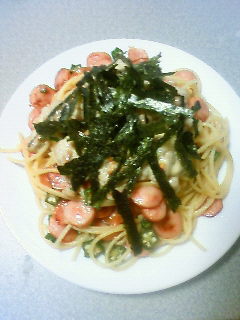 パスタ・納豆・オクラ・ウィンナー・のりです。